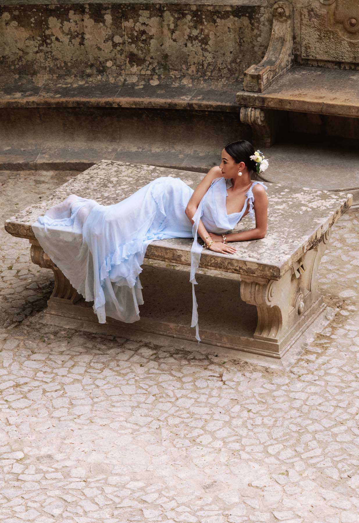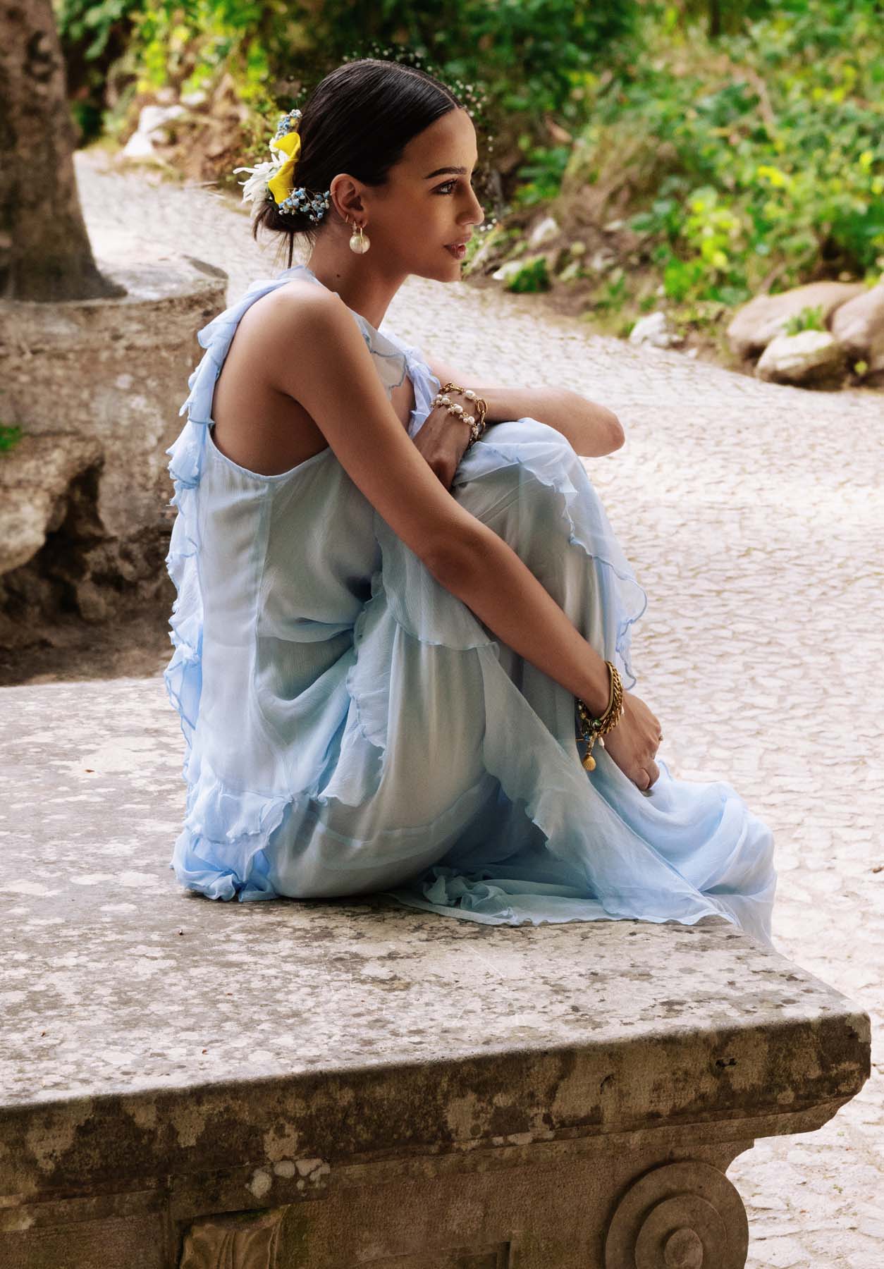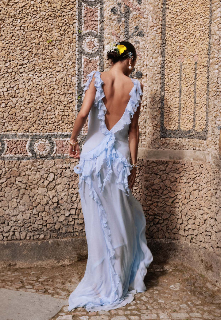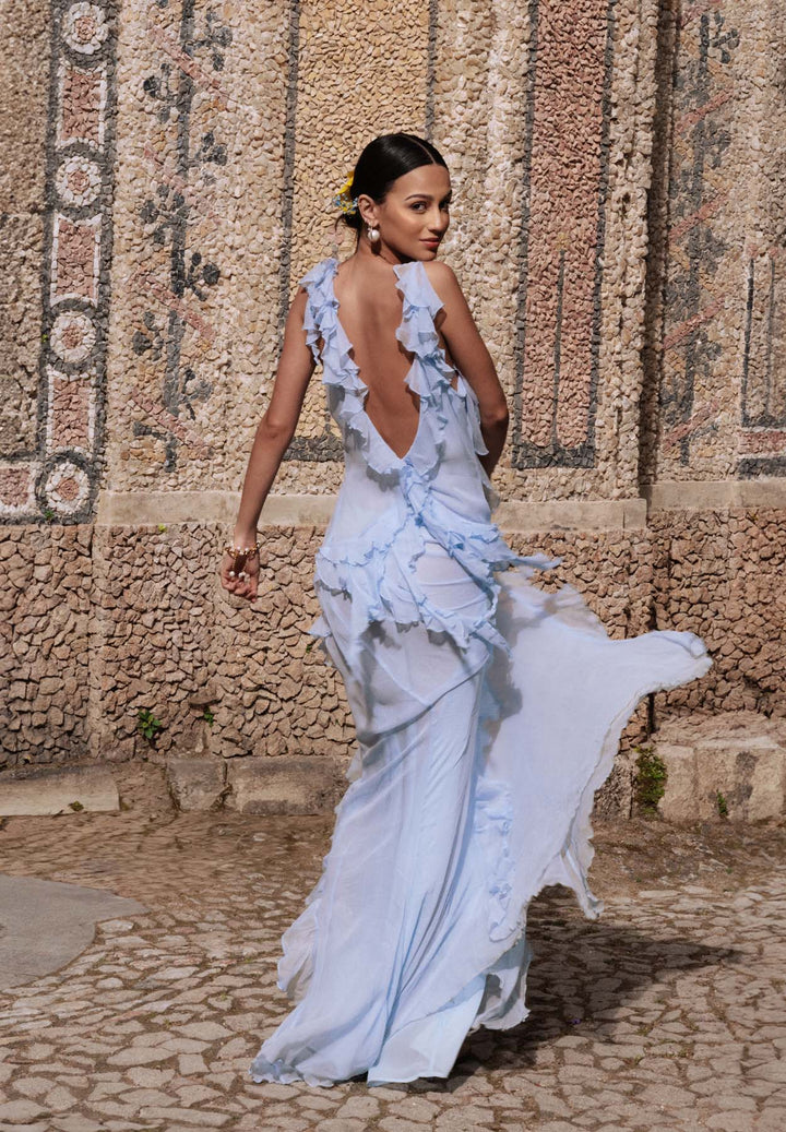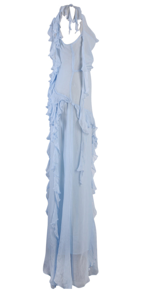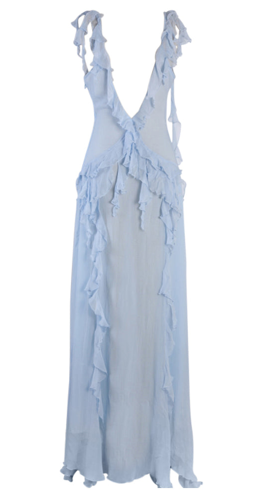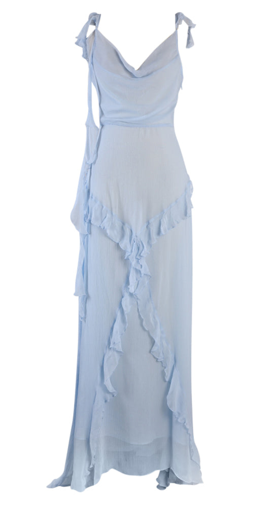 Embrace effortless elegance with the Osun Dress, a refined statement of feminine allure in a beautiful blue cerulean hue. Crafted from chiffon, this semi-sheer maxi dress drapes beautifully, cascading with delicate ruffles and layers for a romantic, dreamlike effect.