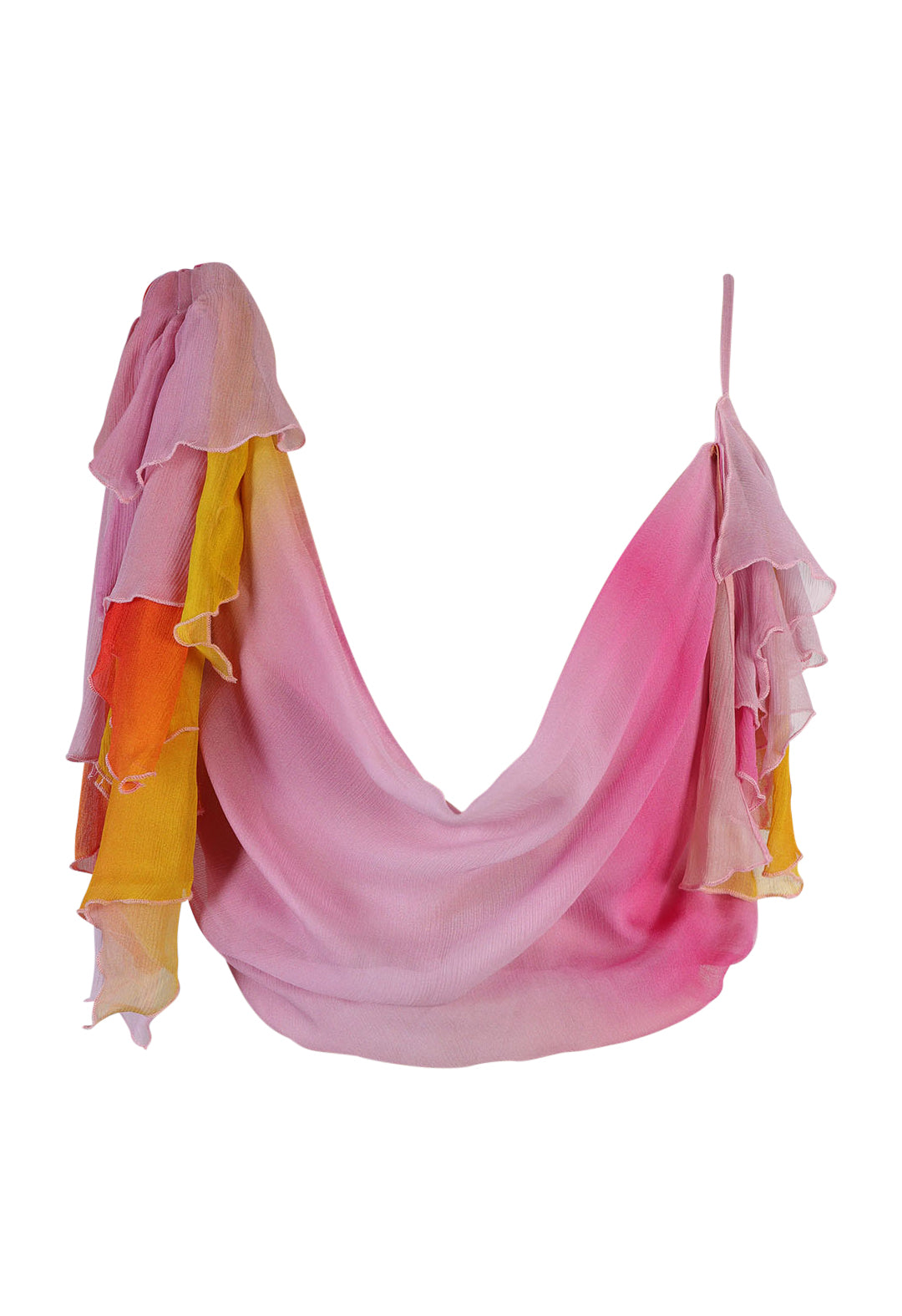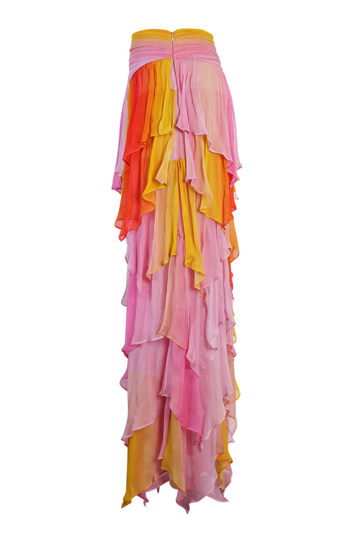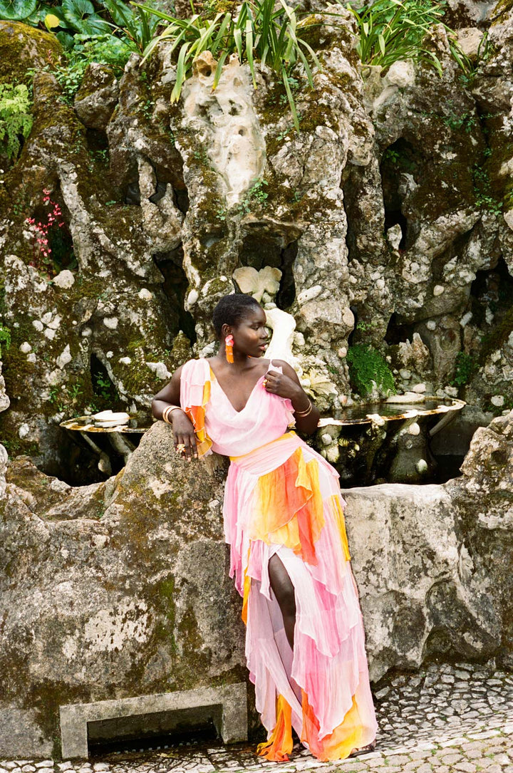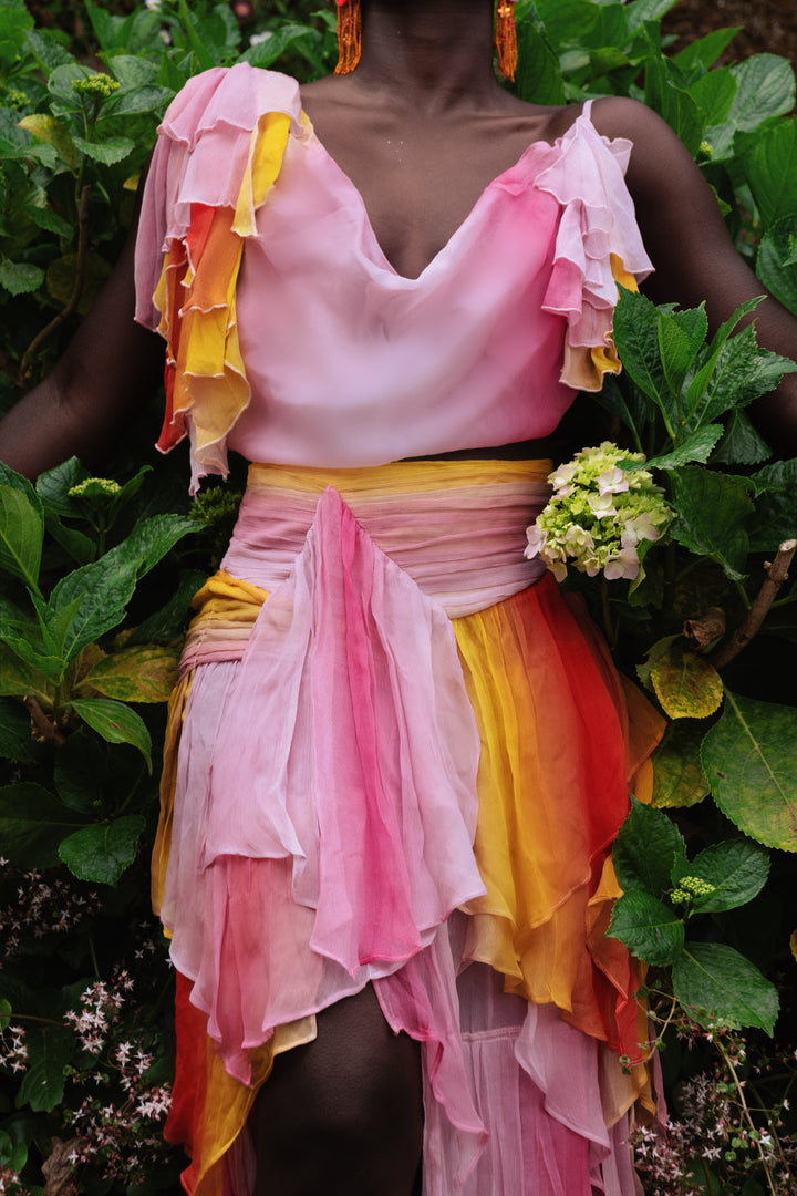A masterful blend of movement and allure, the Oya Set embodies the untamed spirit of the wind. This ethereal chiffon ensemble features a billowing maxi skirt with a pleated waist that flows effortlessly with every step, accented by a daring high slit for a touch of drama.