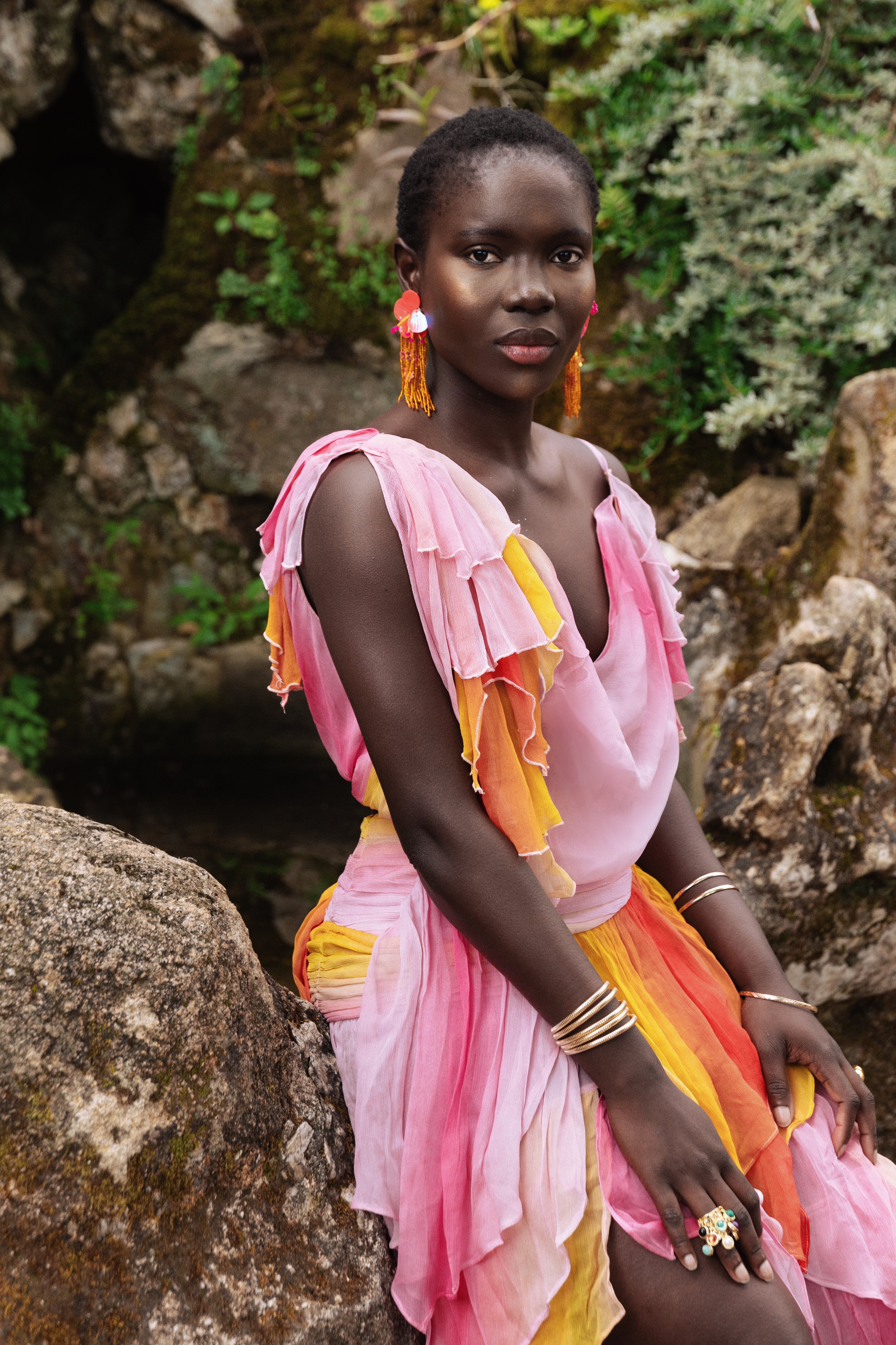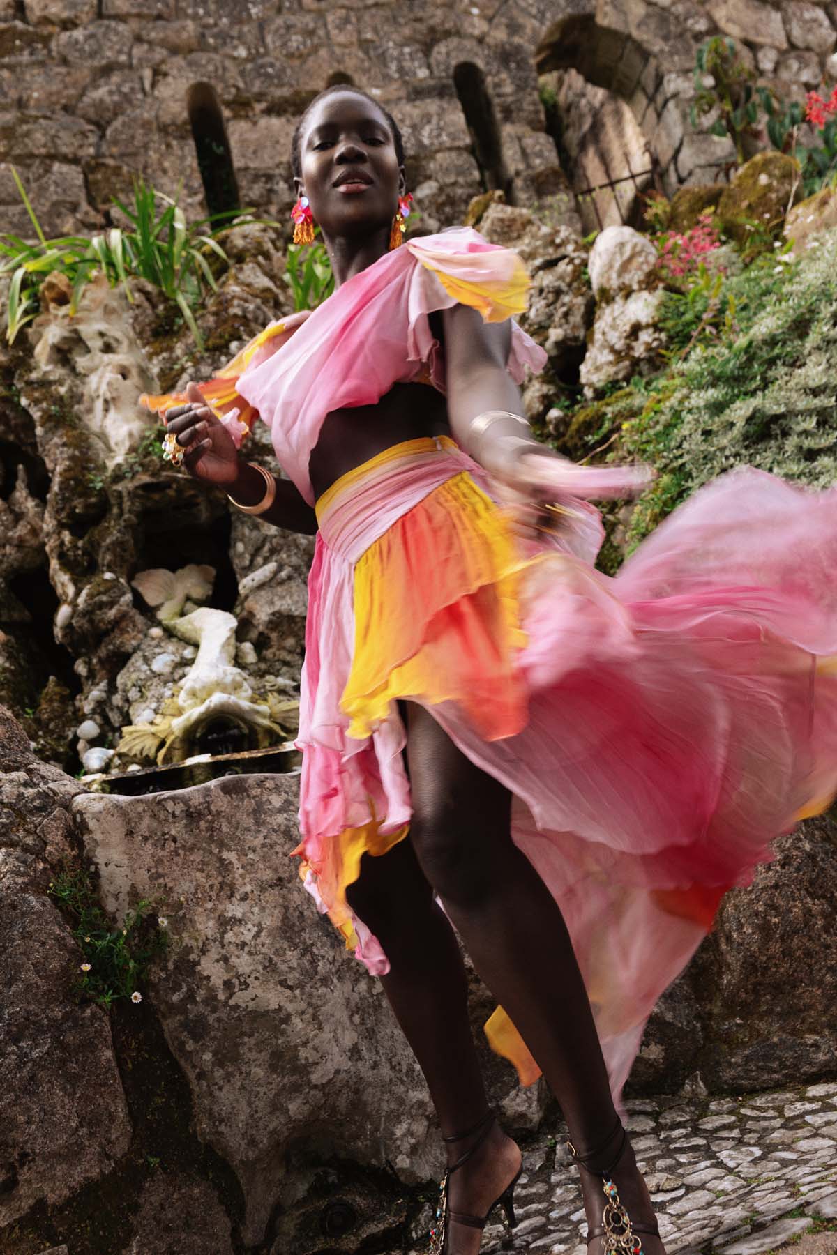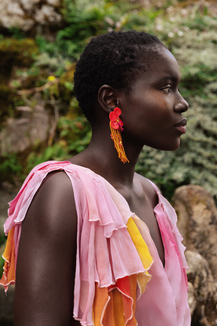 A masterful blend of movement and allure, the Oya Set embodies the untamed spirit of the wind. This ethereal chiffon ensemble features a billowing maxi skirt with a pleated waist that flows effortlessly with every step, accented by a daring high slit for a touch of drama.