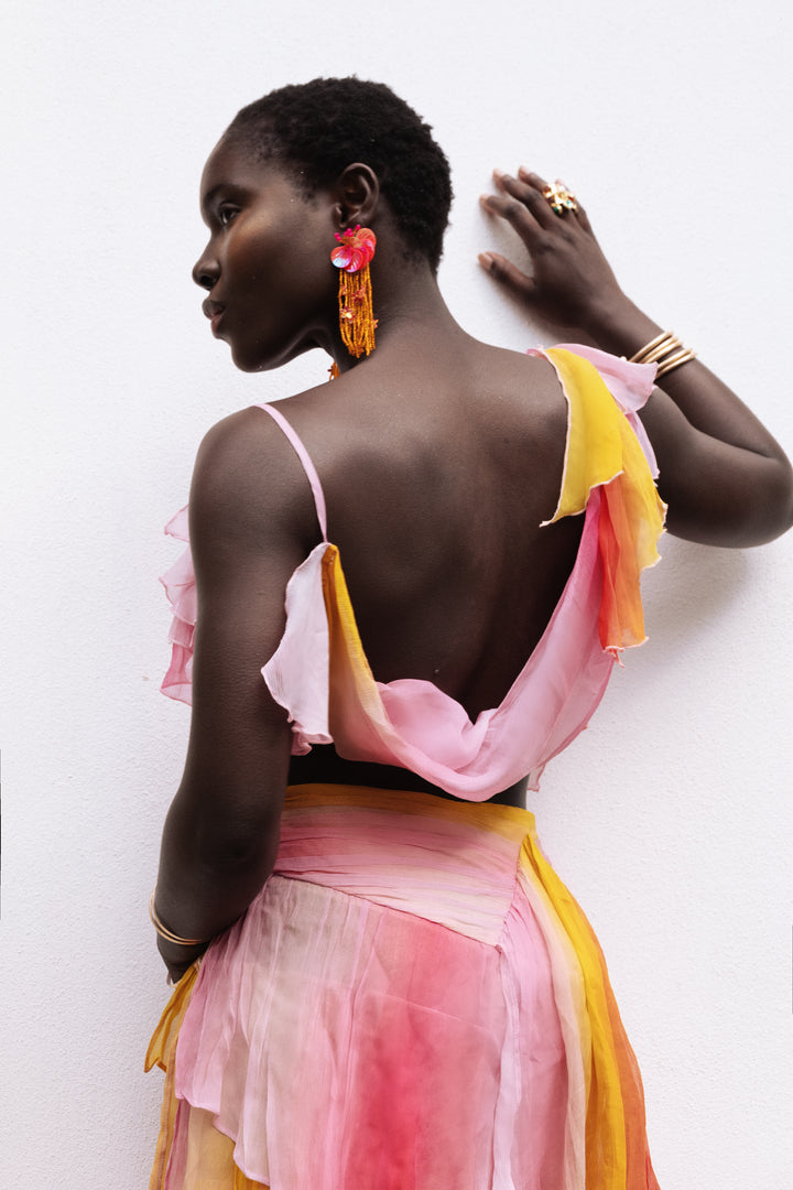 Paired with a draped, open-back top that contours elegantly to the body, this set evokes refined sensuality. The Oya Set captivates with its graceful fluidity, an ode to the goddess it was named after.