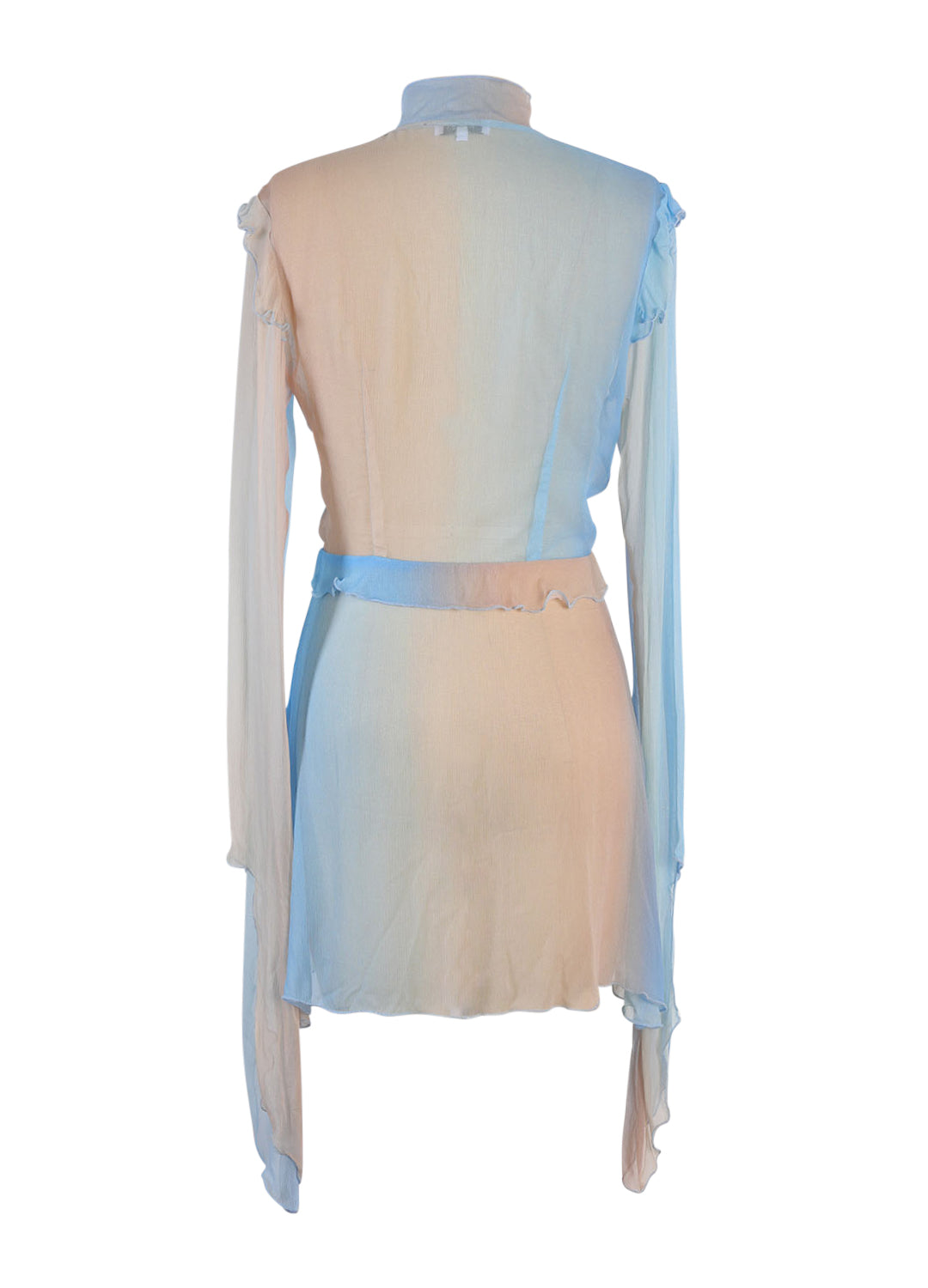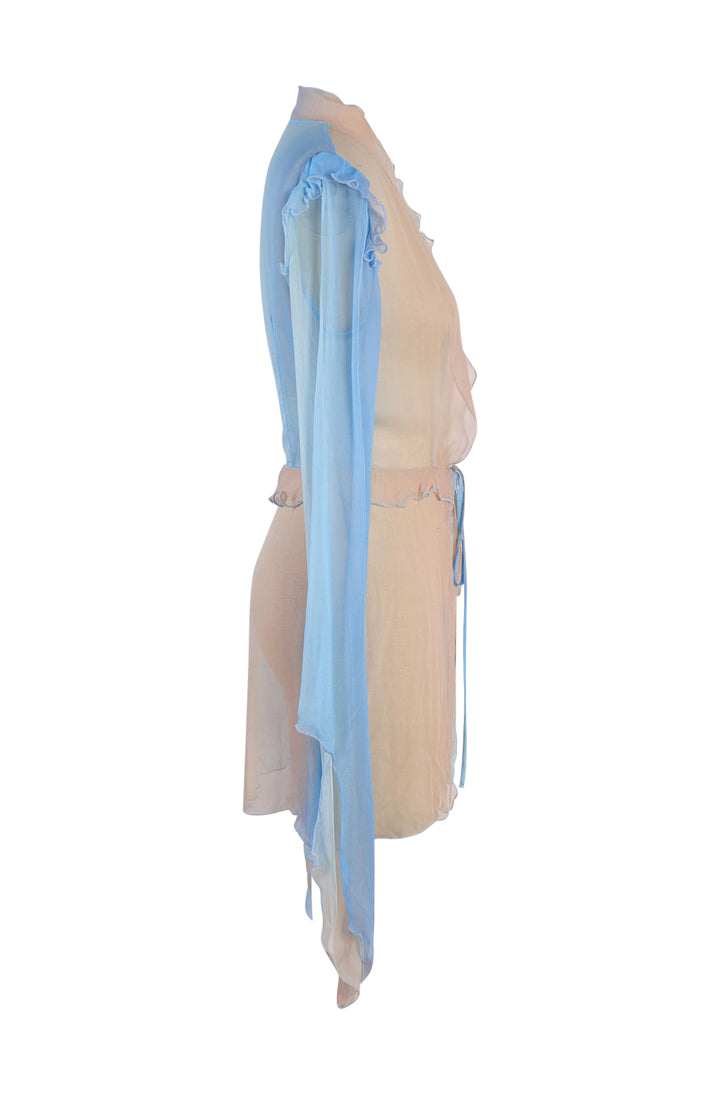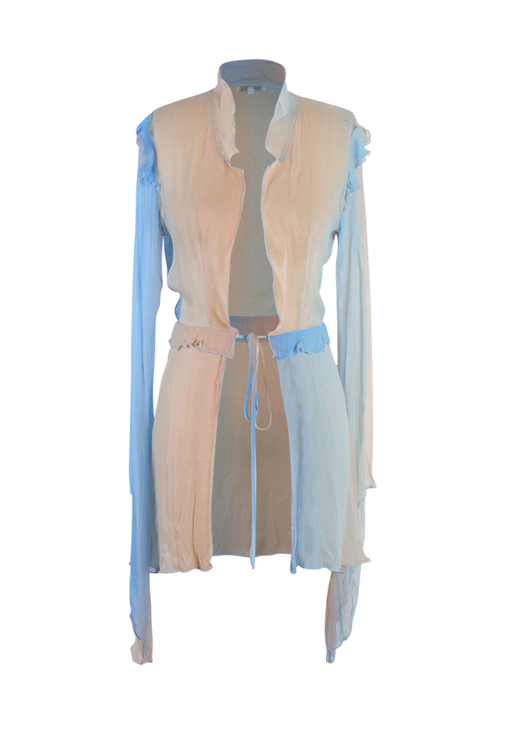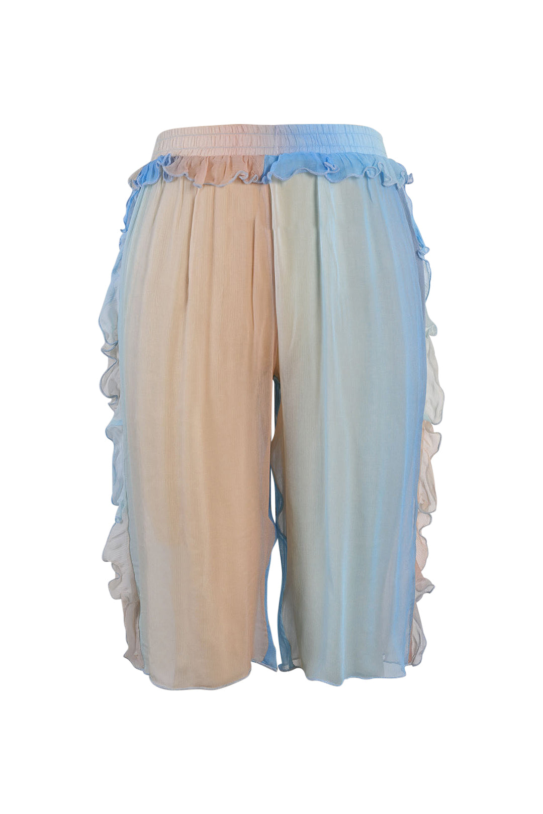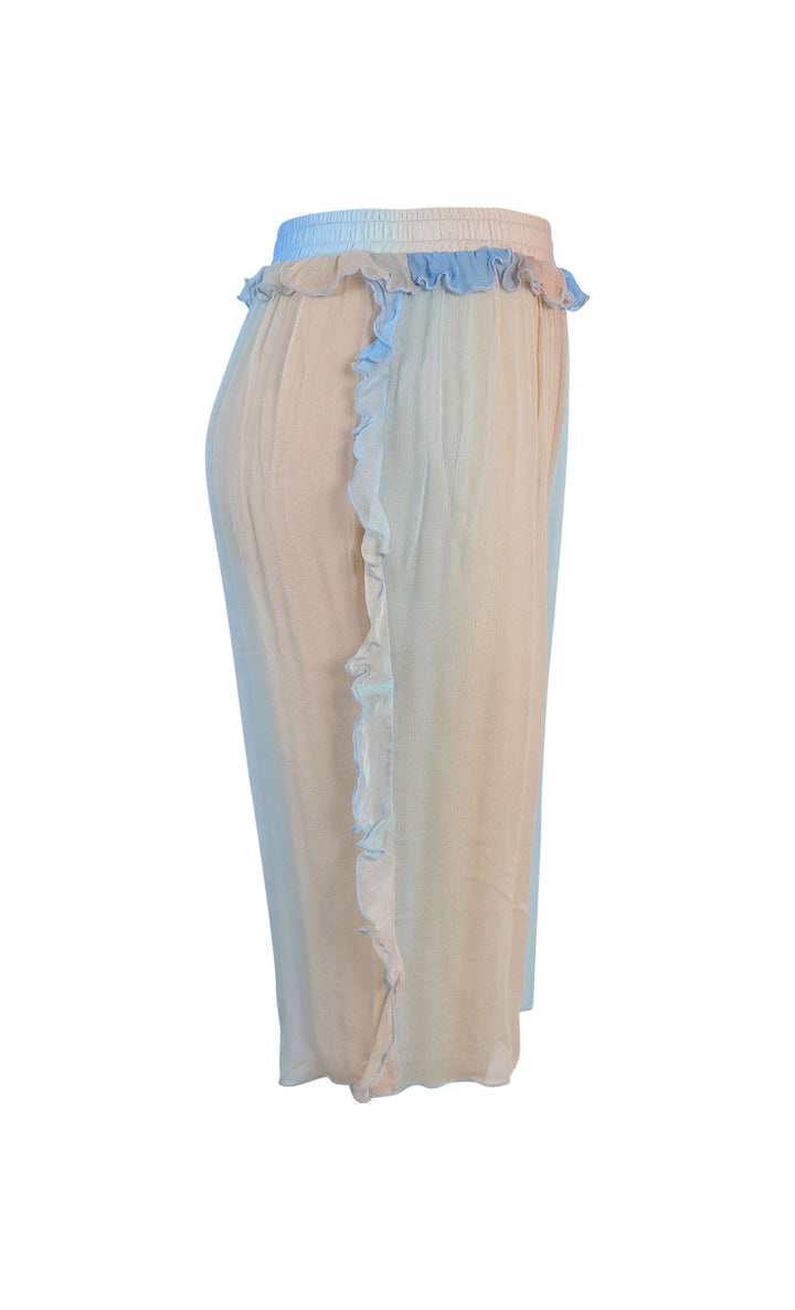 Effortlessness meets seaside allure with the Yemaya Coverup. Crafted from airy chiffon, this sheer blouse and capri shorts set drapes beautifully, featuring elongated sleeves and delicate frills for a fluid, feminine silhouette.
